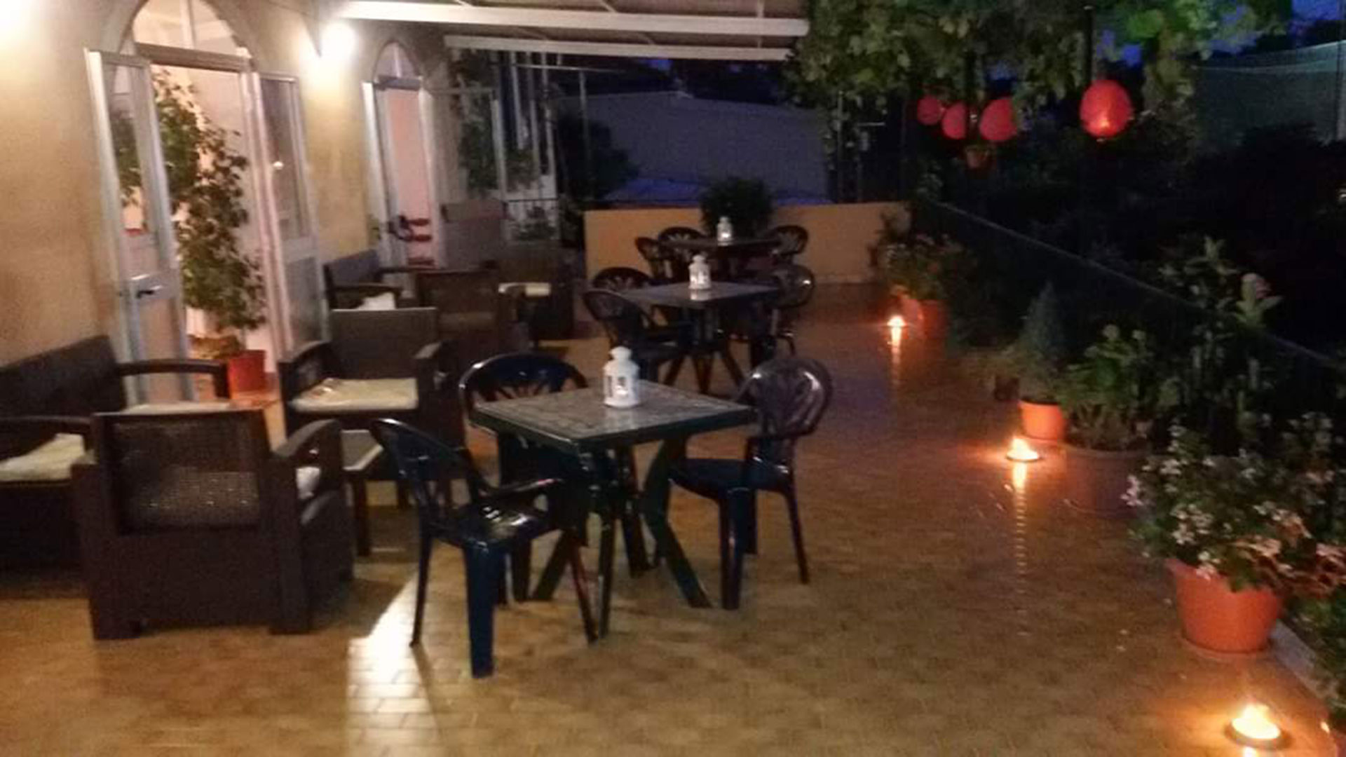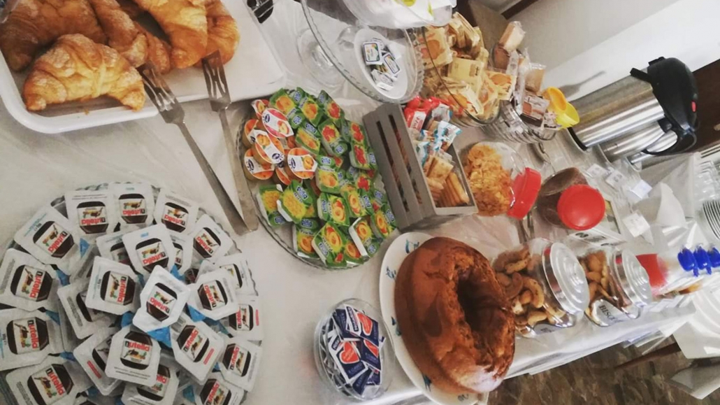 La prima colazione all’italiana viene servita nell’ampio salone o nel terrazzo, con un pergolato che fa da cornice.
